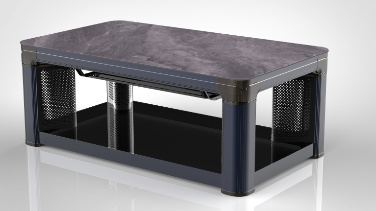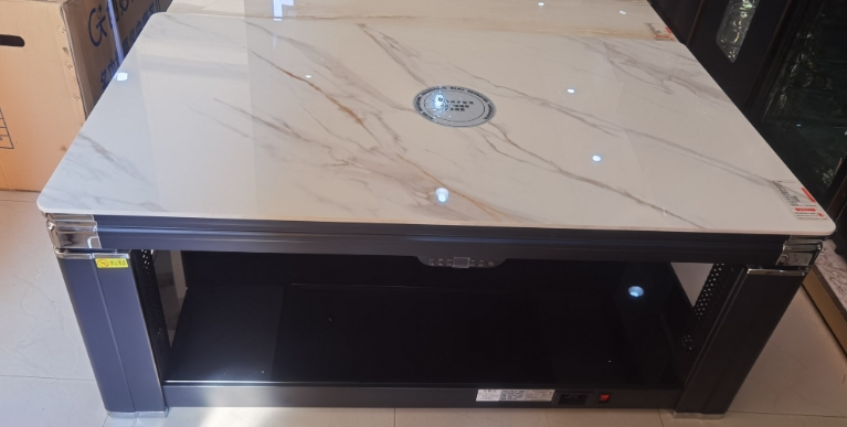 巖板、電磁爐、智能語(yǔ)音,電鍍轉(zhuǎn)角,中層架,鋁板發(fā)熱,黑木紋色,收納線盒,單開(kāi)關(guān)控制
